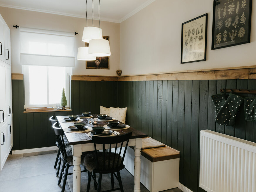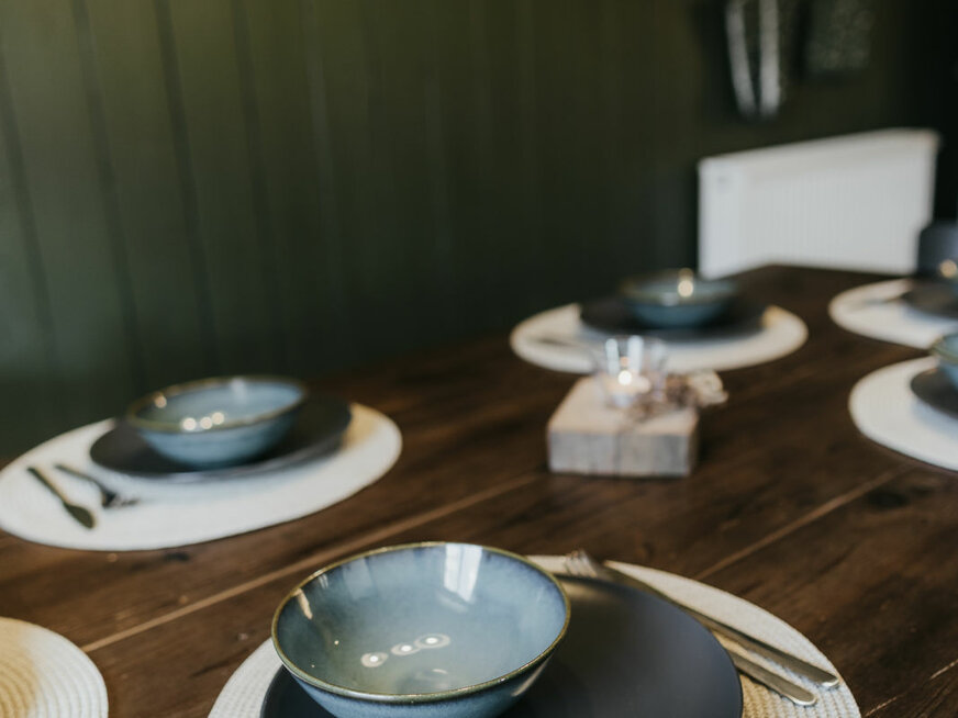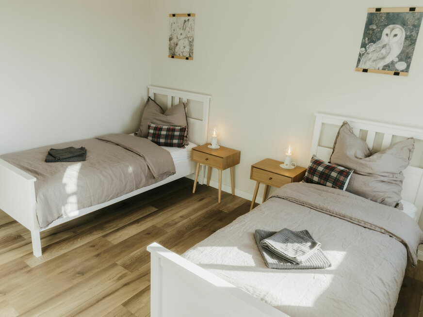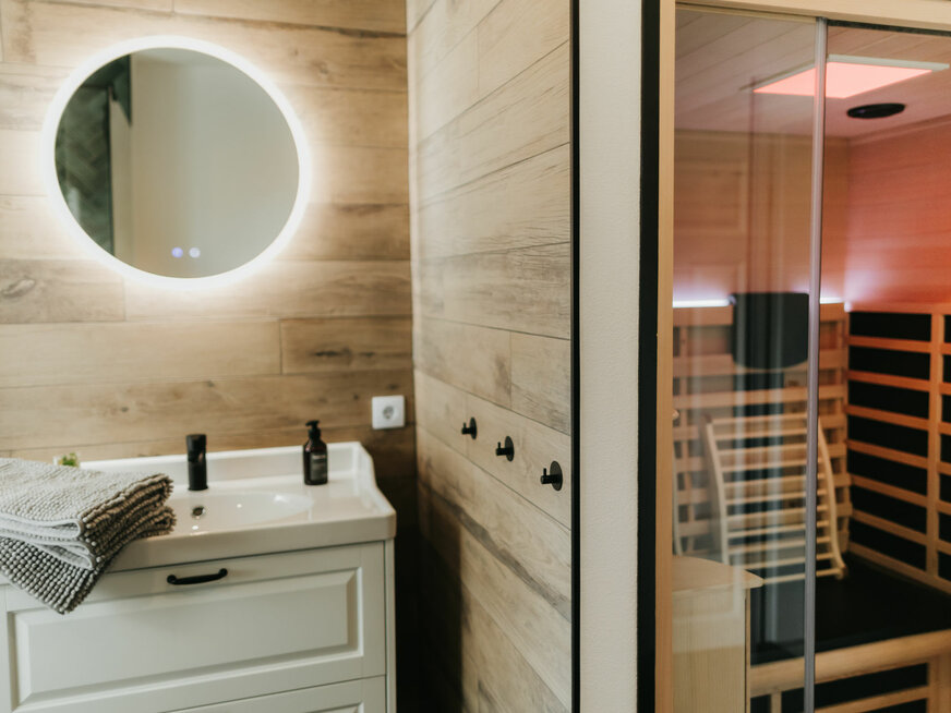 Unsere erste Ferienwohnung, der Fuchsbau, bietet auf großzügigen 100 m² Platz für bis zu sechs Personen. Drei gemütliche Schlafzimmer, eine voll ausgestattete Küche und eine einladende Wohnstube im Stil eines Waldhauses machen euren Aufenthalt zu einem echten Wohlfühlerlebnis. Als besonderes Highlight lädt euch die Infrarot-Sauna nach einem aktiven Tag zum Entspannen ein.